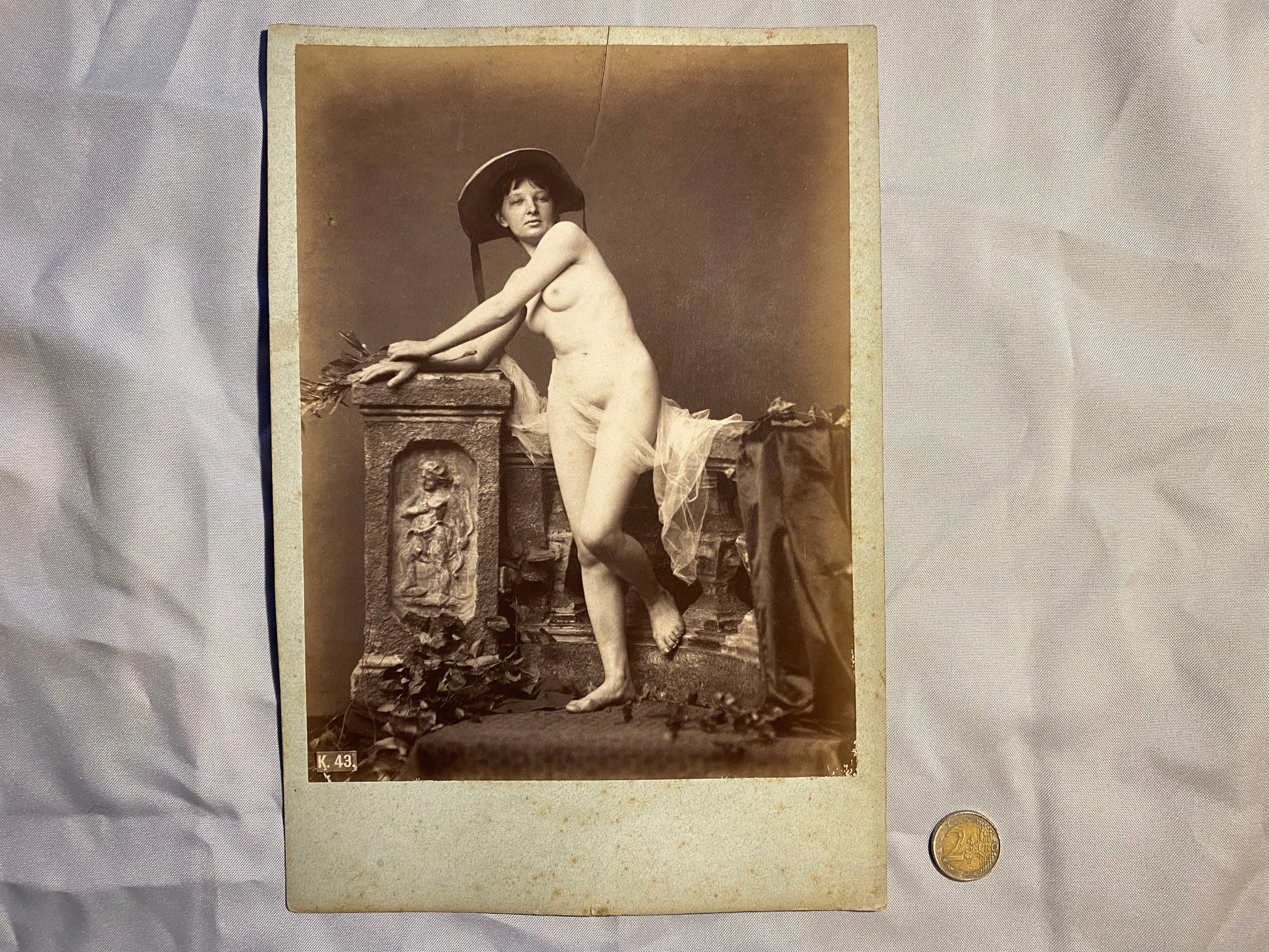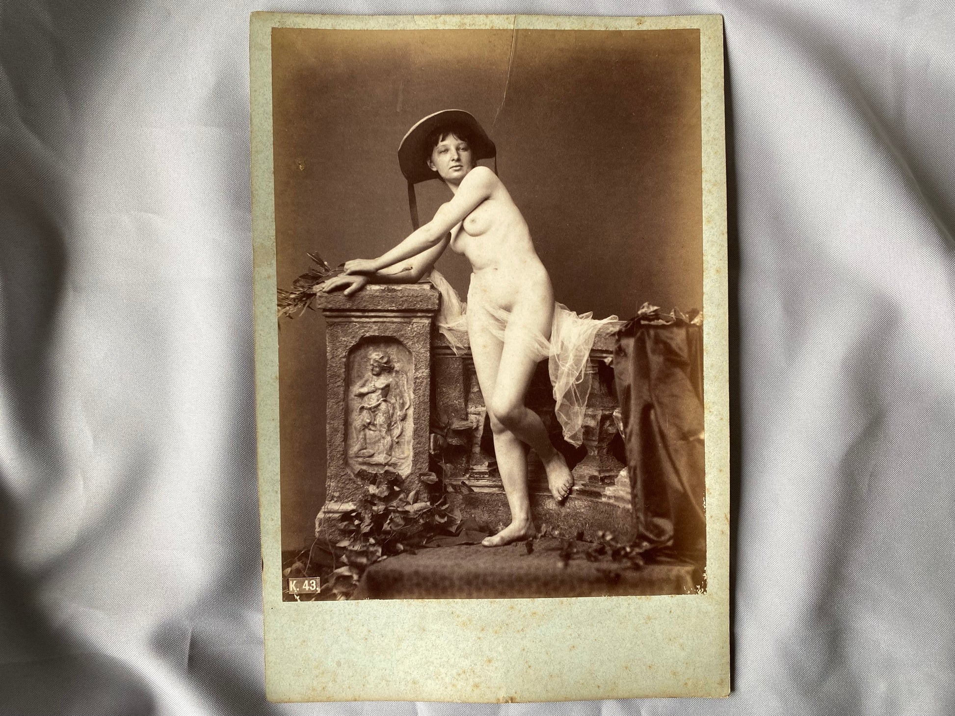 Diese originale Aktfotografie einer Frau um die Jahrhundertwende fängt die zeitlose Schönheit und Eleganz des menschlichen Körpers in einem Moment der Stille und Intimität ein. Das schwarzweiße Foto zeichnet sich durch weiche Licht- und Schattenspiele aus, die die Konturen und Formen des Körpers stilvoll hervorheben. Die Pose der Frau, zugleich natürlich und kunstvoll arrangiert, spiegelt eine Ästhetik wider, die sowohl in der Kunstfotografie als auch in der klassischen Aktmalerei zu finden ist.