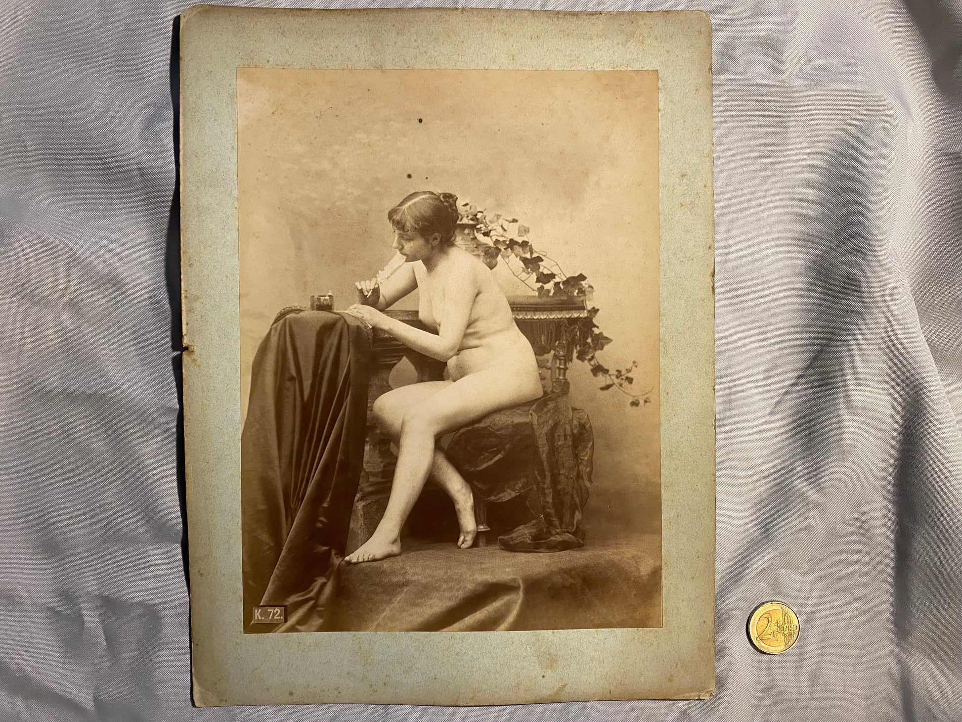 Diese originale Aktfotografie einer Frau um die Jahrhundertwende fängt die zeitlose Schönheit und Eleganz des menschlichen Körpers in einem Moment der Stille und Intimität ein. Das schwarzweiße Foto zeichnet sich durch weiche Licht- und Schattenspiele aus, die die Konturen und Formen des Körpers stilvoll hervorheben. Die Pose der Frau, zugleich natürlich und kunstvoll arrangiert, spiegelt eine Ästhetik wider, die sowohl in der Kunstfotografie als auch in der klassischen Aktmalerei zu finden ist.