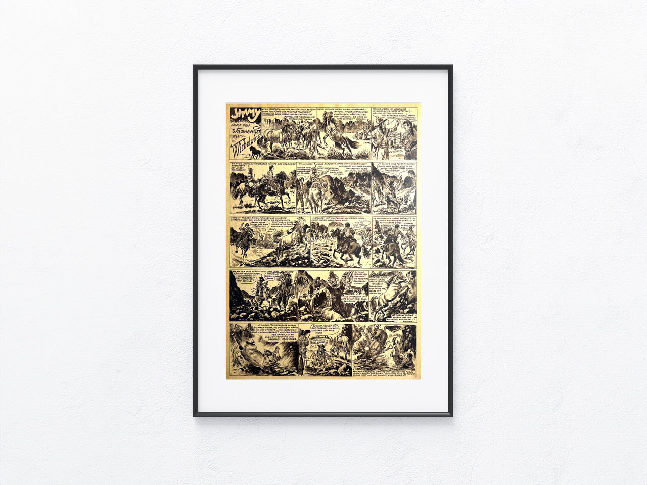 Diese einzigartige Comicseite aus den 1950er Jahren ist ein zeitloses Schmuckstück und eine lebhafte Erinnerung an die goldene Ära der Comics. Die Patina verleiht ihr einen Hauch von Nostalgie und Authentizität, perfekt für alle, die einen Hauch von Retro-Charme in ihrem Zuhause schätzen. Als einzigartiges Original und kein bloßer Nachdruck ist sie ein unverzichtbares Juwel für Comic-Enthusiast*innen und eine stilvolle Bereicherung für jede Sammlung.