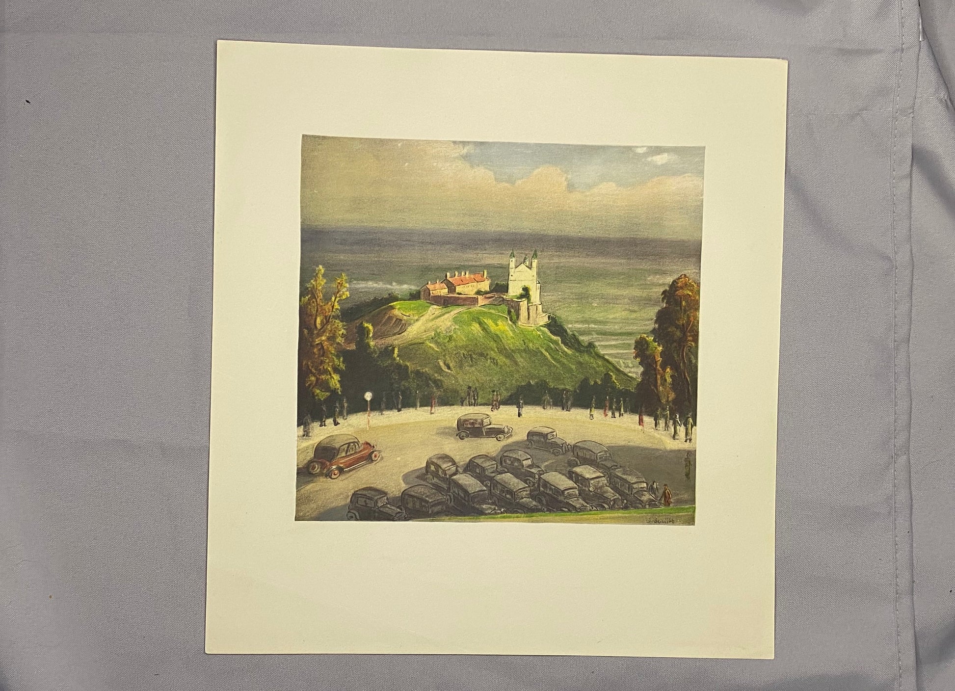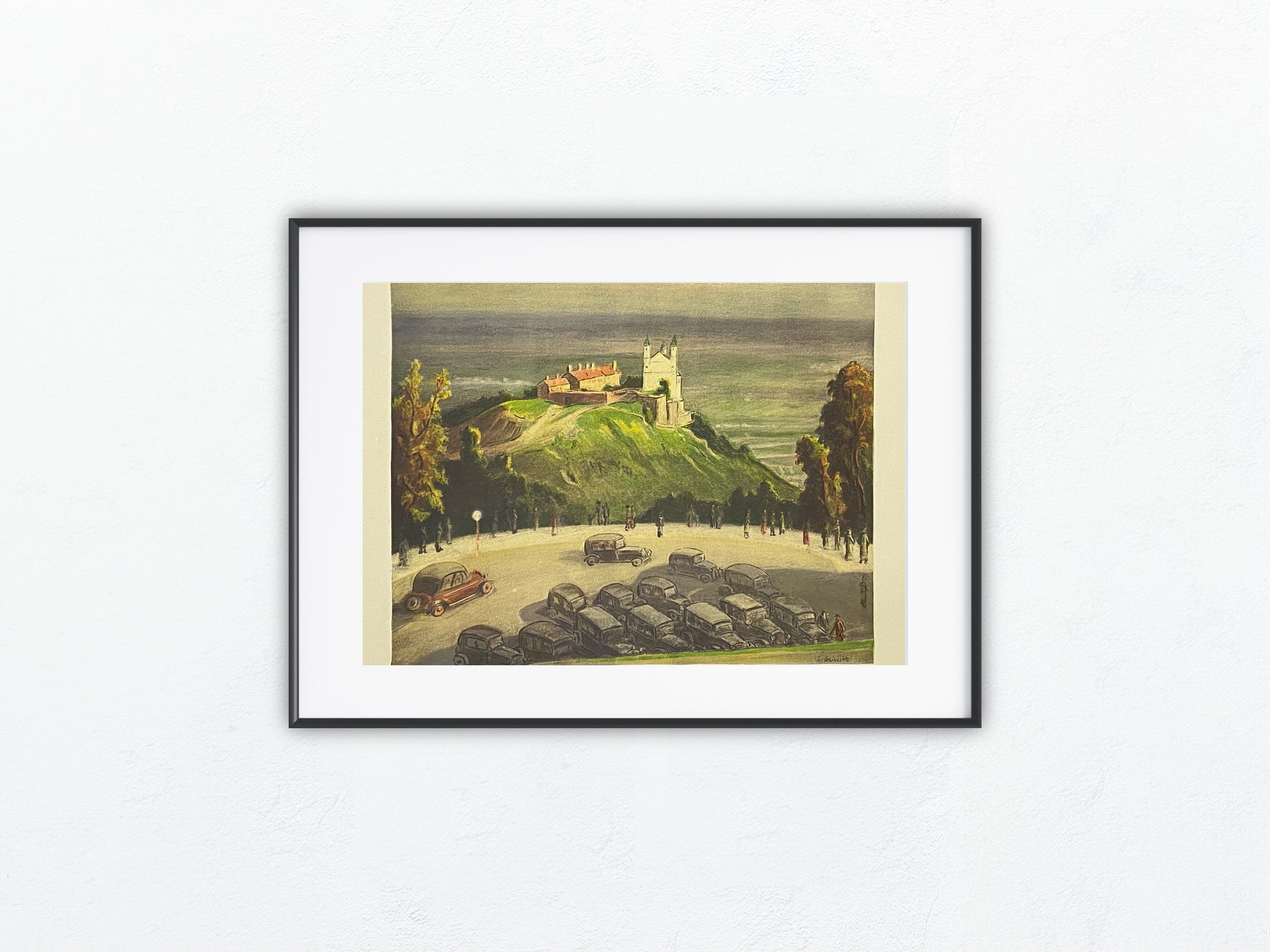 Original Farblithografie von Gustav Schütt aus ca. 1930 mit eindrucksvollem Blick vom Kahlenberg auf den Leopoldsberg. Im Vordergrund ein Ausflugsplatz mit zahlreichen abgestellten Automobilen und Spaziergängern, die den Panoramablick genießen. Dahinter erhebt sich auf dem Hügel die Kirche am Leopoldsberg, umgeben von grüner Natur und mit weitem Ausblick über das Donautal.