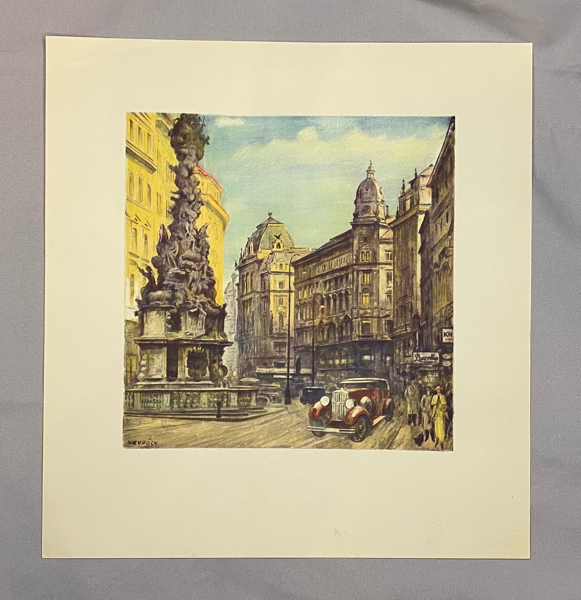 Original Farblithografie von Maximilian Neuböck aus ca. 1930 mit belebter Ansicht des Wiener Grabens und der berühmten Pestsäule. Im Vordergrund das barocke Denkmal mit eindrucksvoller Figurenkomposition, flankiert von prächtigen Ringstraßenbauten. Auf der Straße ein eleganter Oldtimer sowie Spaziergänger in zeittypischer Mode – ein charmantes Zeugnis der Wiener Innenstadt um 1930.