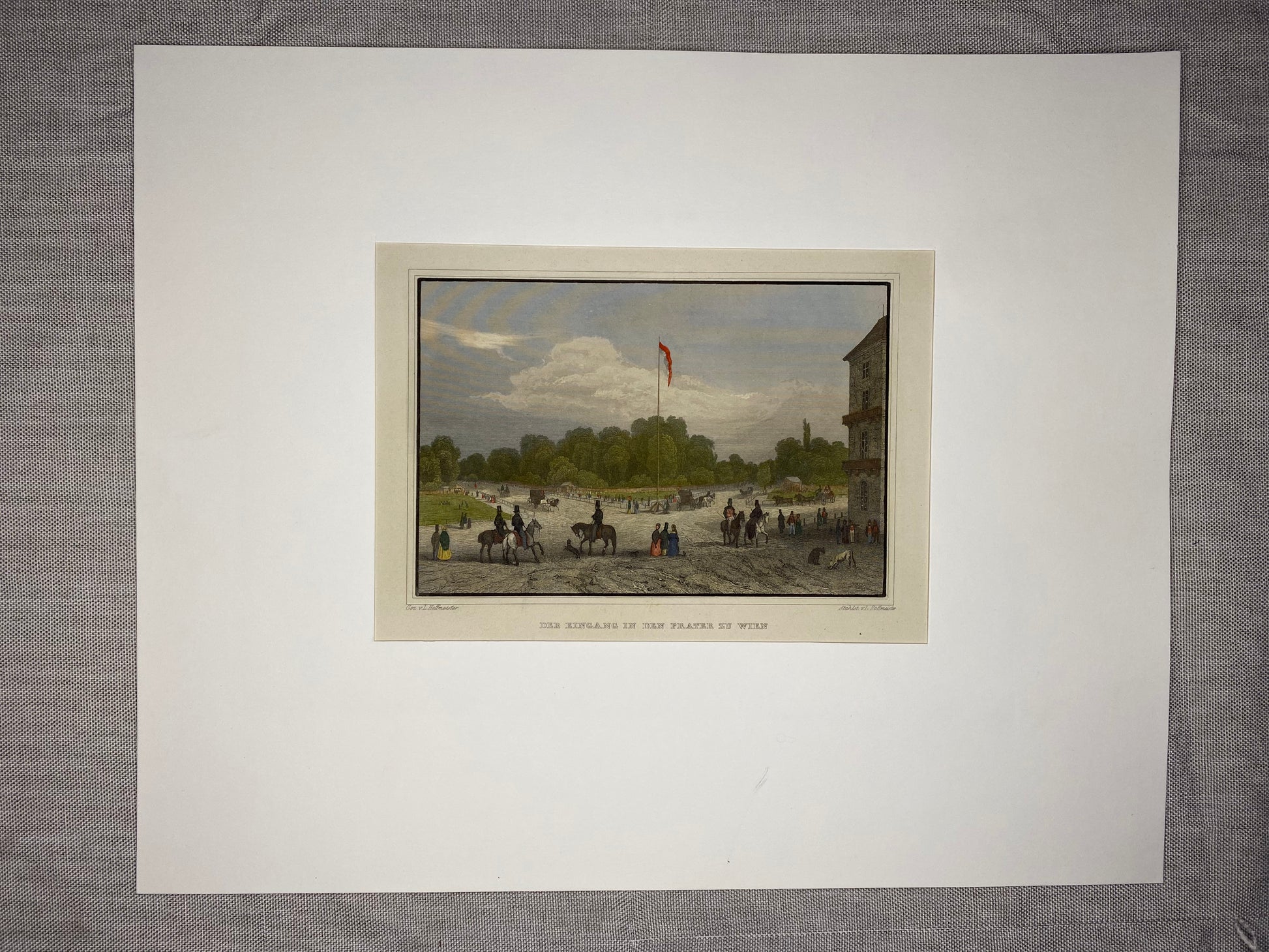 Dekorative Ansicht des Eingangs in den Wiener Prater, entstanden im 19. Jahrhundert. Dargestellt ist eine belebte Szene mit Spaziergängern, Reitern und Kutschen vor dem großen Fahnenmast am Praterzugang. Die detailreiche Kolorierung vermittelt einen lebendigen Eindruck des beliebten Wiener Vergnügungs- und Erholungsortes.