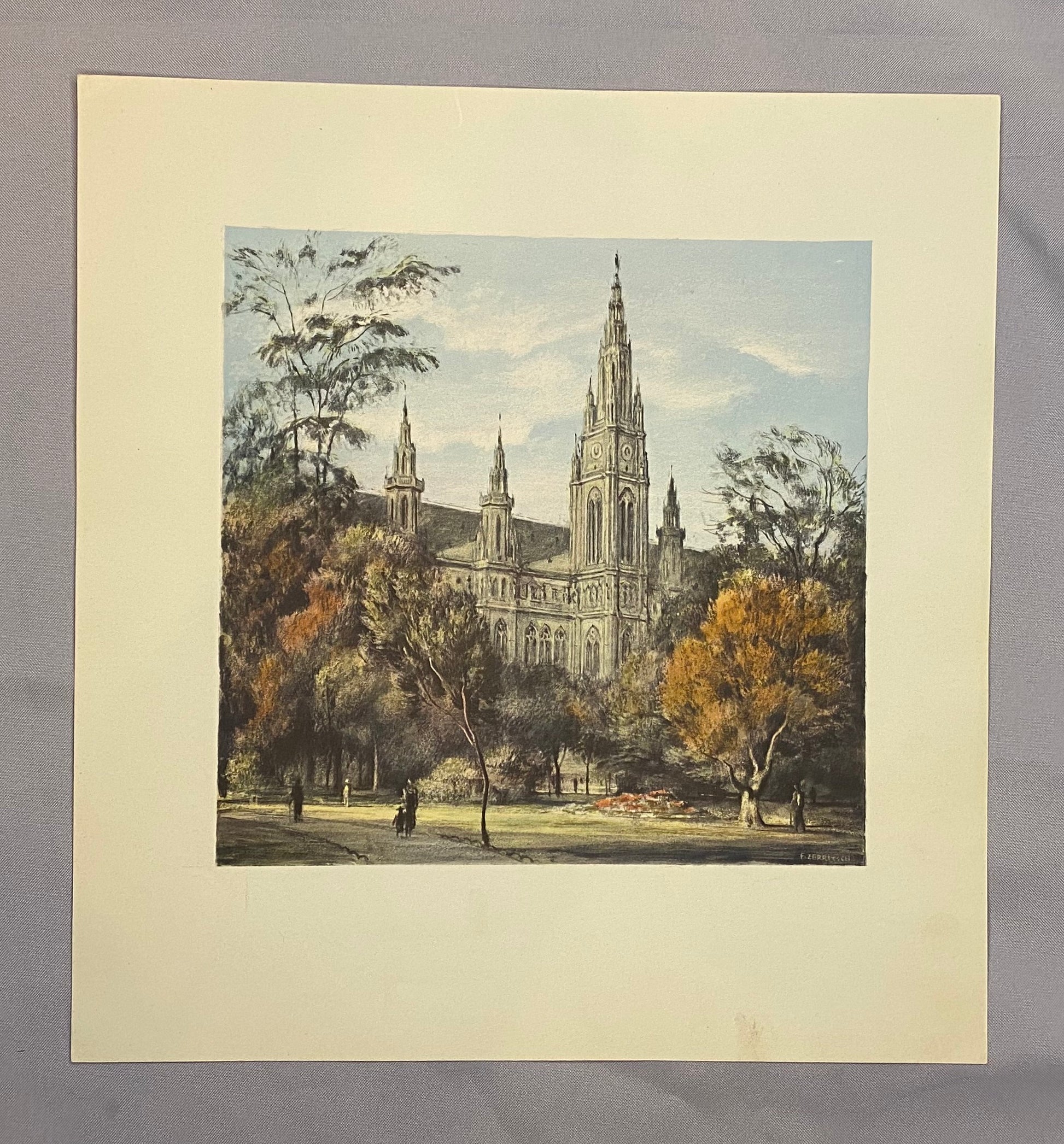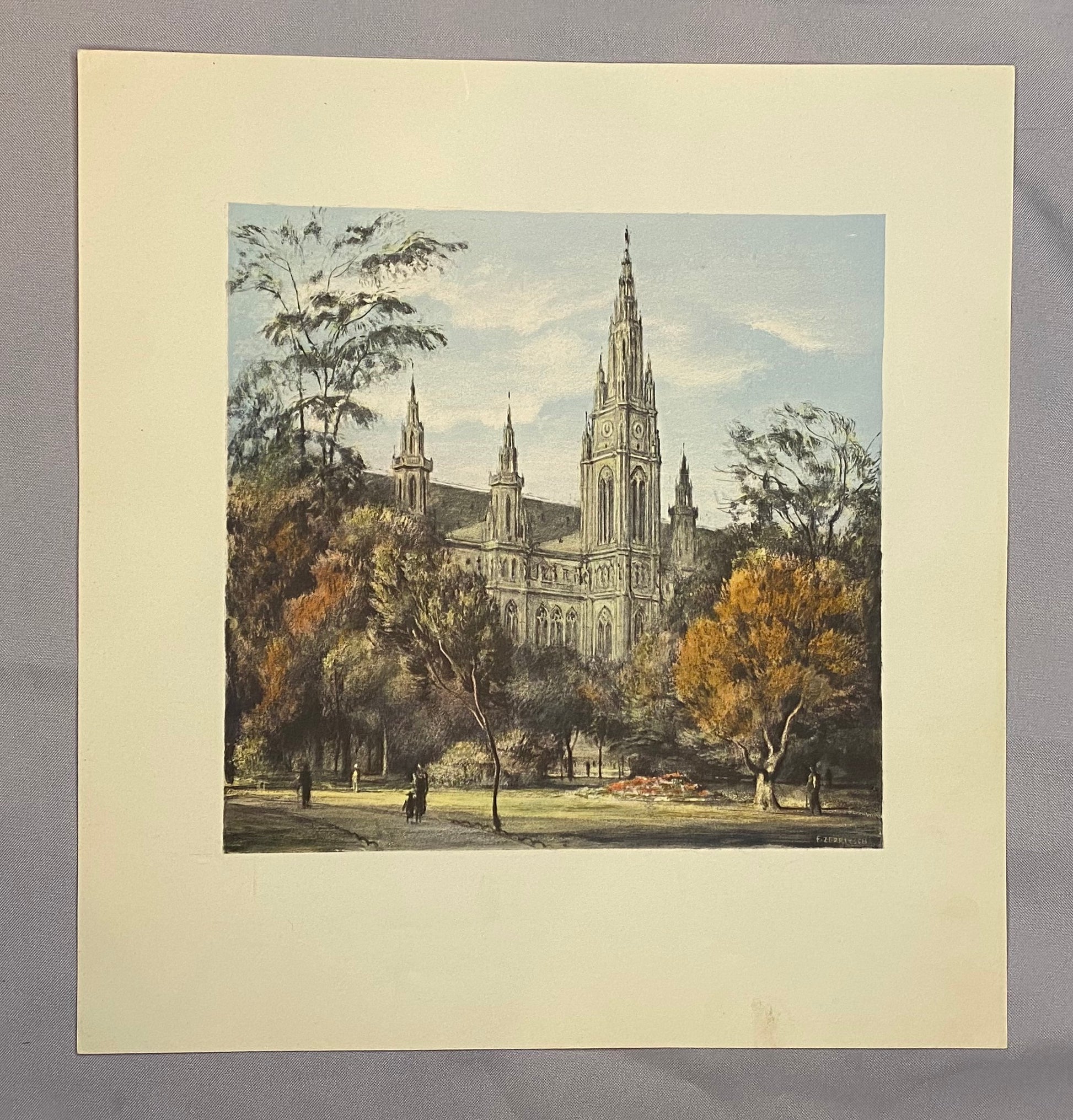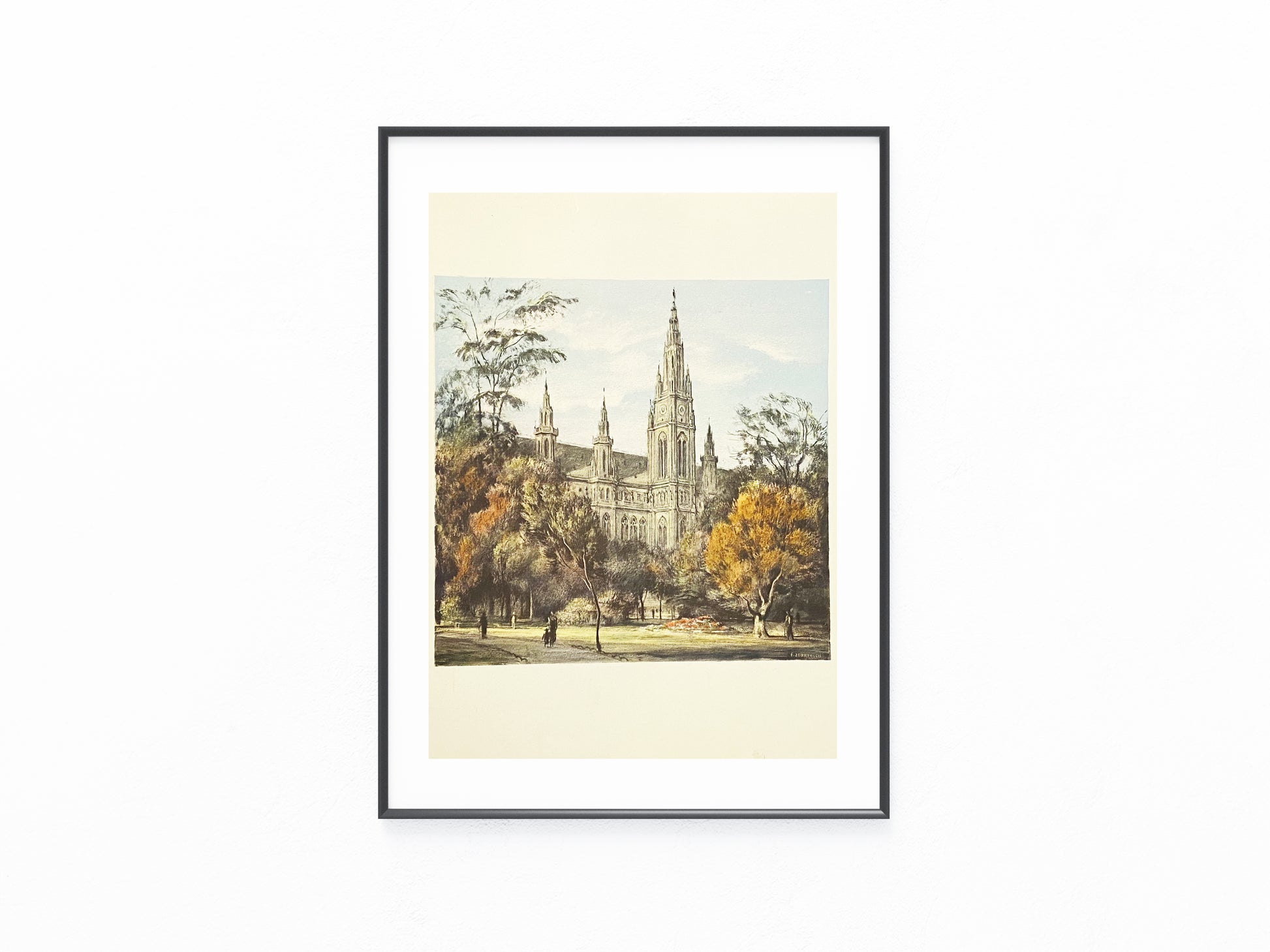 Original Farblithografie aus ca. 1930 mit Blick auf das Wiener Rathaus im Rathauspark. Die neugotische Architektur mit ihren markanten Türmen erhebt sich eindrucksvoll über die Bäume, während Spaziergänger den Park durchqueren. Die Szene vermittelt charmant die Atmosphäre des Wien der Zwischenkriegszeit.