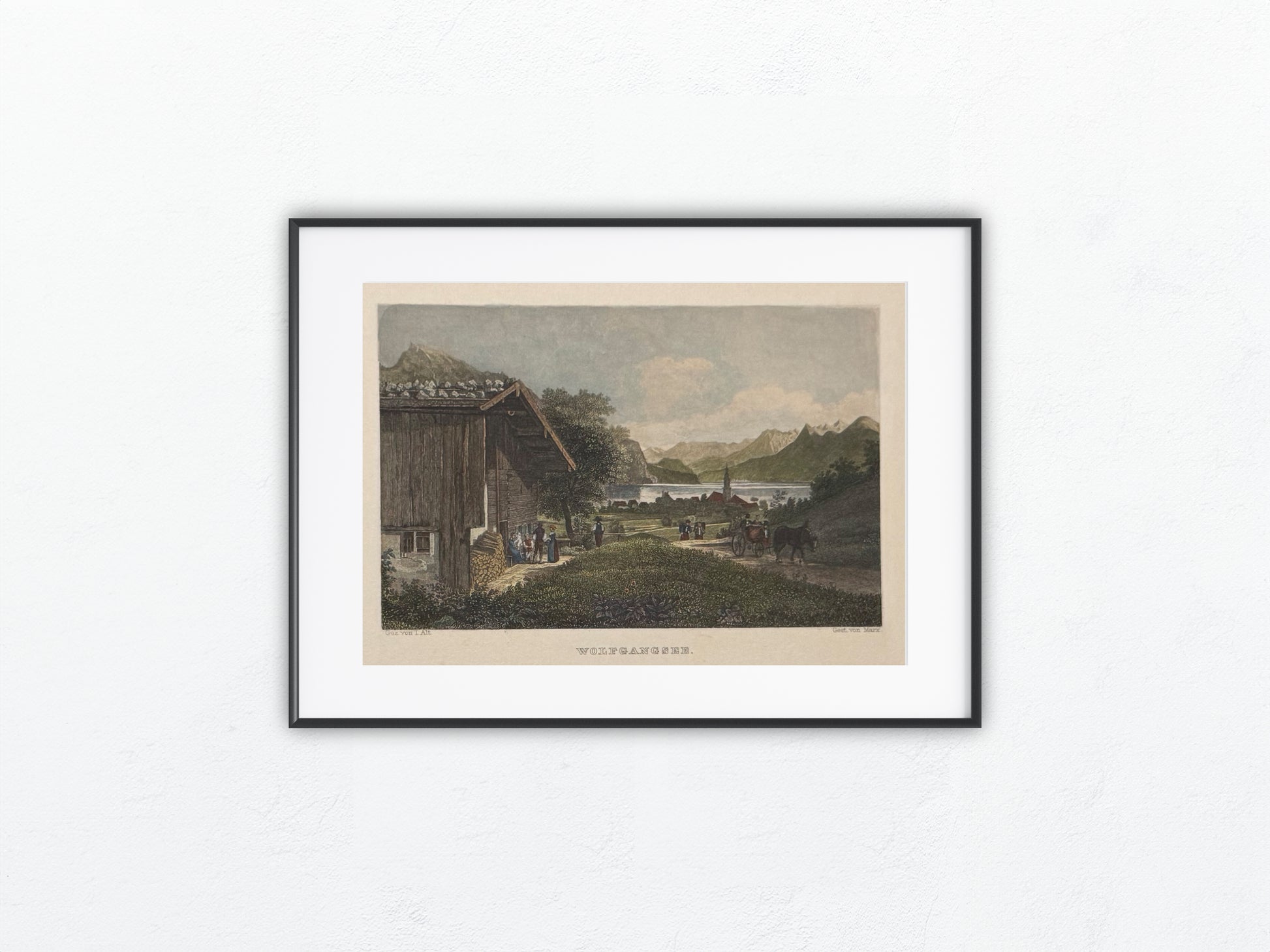 Detailreiche Ansicht des Wolfgangsees um 1850, in feiner Handkolorierung. Die Szene zeigt eine bäuerliche Alltagsszenerie mit Blick auf See, Kirche und umliegende Berge. Im Vordergrund ein Hof mit Menschen, weiter hinten eine Pferdekutsche auf dem Weg nach St. Wolfgang. Die zarten Farbtöne und der klare Aufbau machen diese Lithografie zu einem typischen Vertreter romantischer Reiseliteratur des 19. Jahrhunderts.